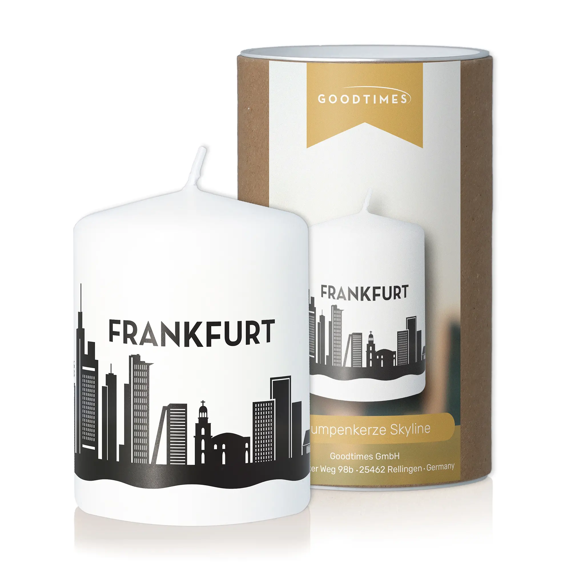 Mit dieser schönen Stumpenkerze erlebt man den Flair der Stadt Frankfurt bei gemütlichem Kerzenschein am Abend zu Hause.